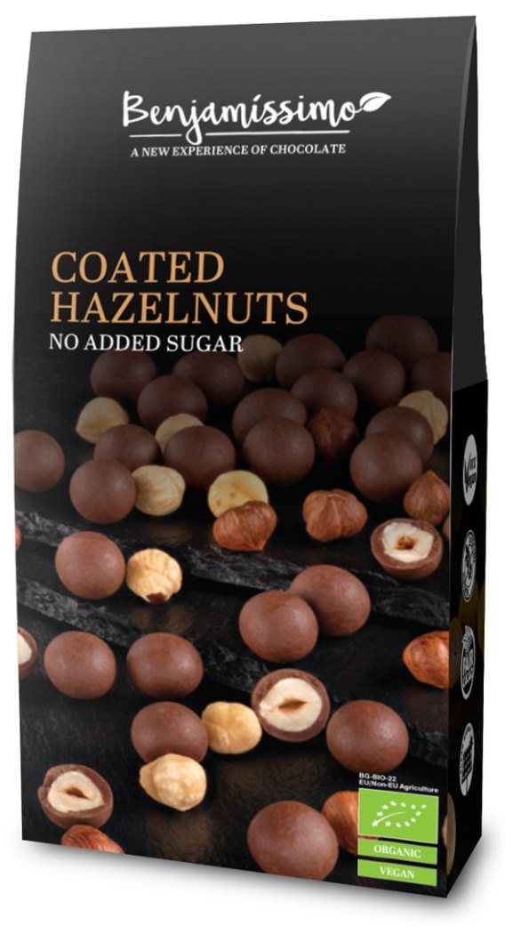 ORZECHY LASKOWE W CZEKOLADZIE PRALINOWEJ BEZ DODATKU CUKRÓW BEZGLUTENOWE BIO 60 g - BENJAMISSIMO BENJAMISSIMO (czekolady, migdały, orzeszki)